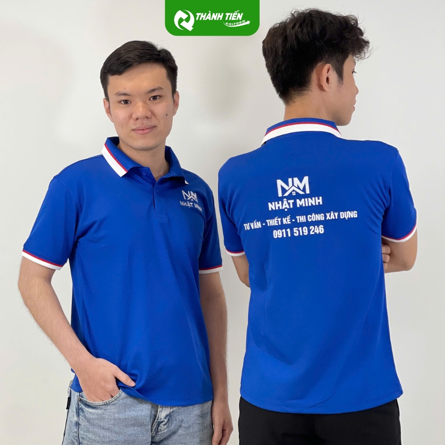 Mẫu áo màu xanh dương nổi bật với viền cổ và tay áo phối màu trắng đỏ. Màu xanh tượng trưng cho sự tin cậy, chuyên nghiệp, phù hợp với các bộ phận thường xuyên tiếp xúc khách hàng hoặc vận hành ngoài trời. Đây là màu sắc chủ đạo giúp khách hàng dễ dàng nhận diện nhân viên Nhật Minh ngay từ cái nhìn đầu tiên.